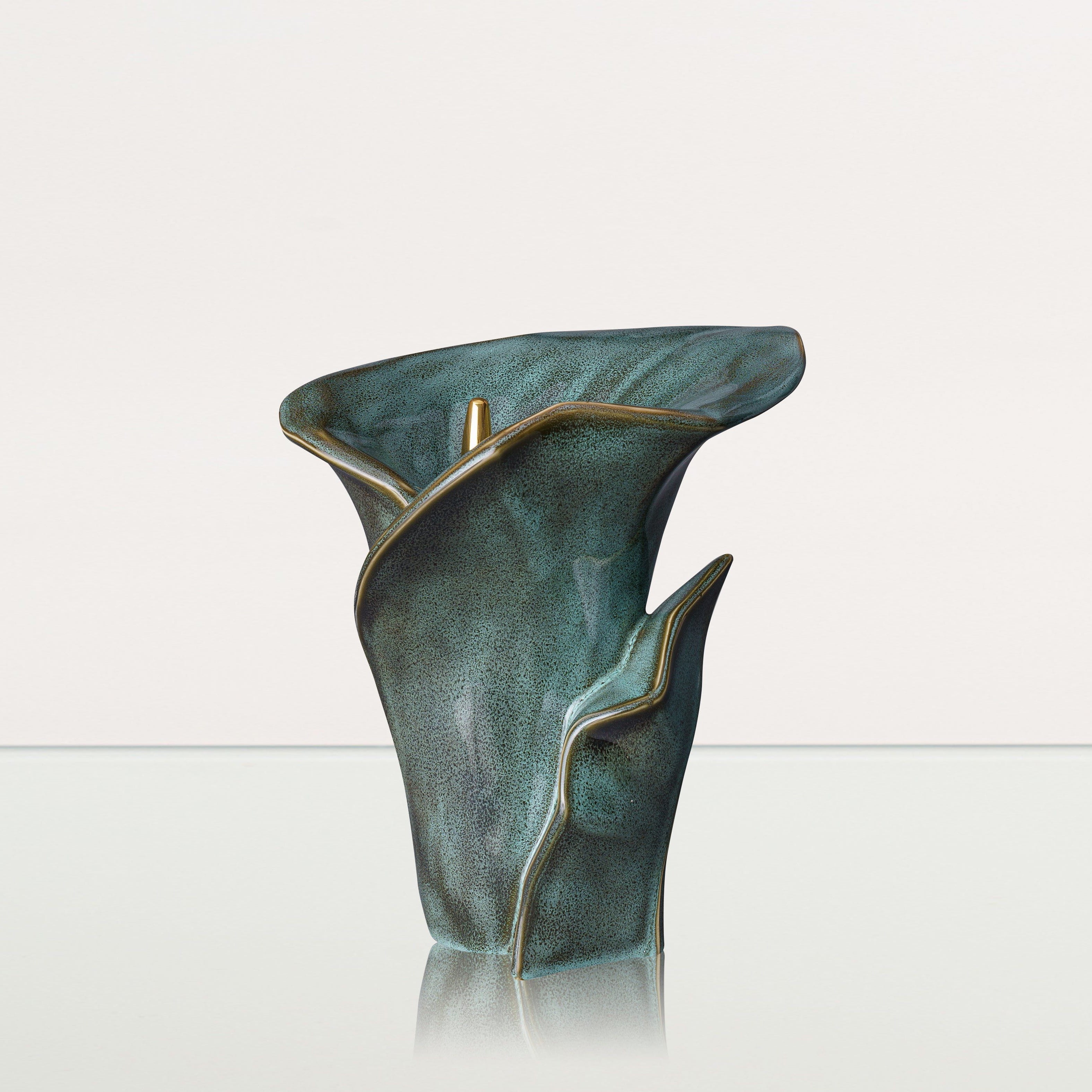 Presentiamo l’Urna Memoriale a Fiore di Calla per Ceneri – Oily Green Melange, un pezzo raffinato realizzato da Pulvis Art Urns. Questa urna presenta un design contemporaneo unico che cattura con eleganza la forma del fiore di calla, offrendo un tributo distintivo alla memoria della persona amata.