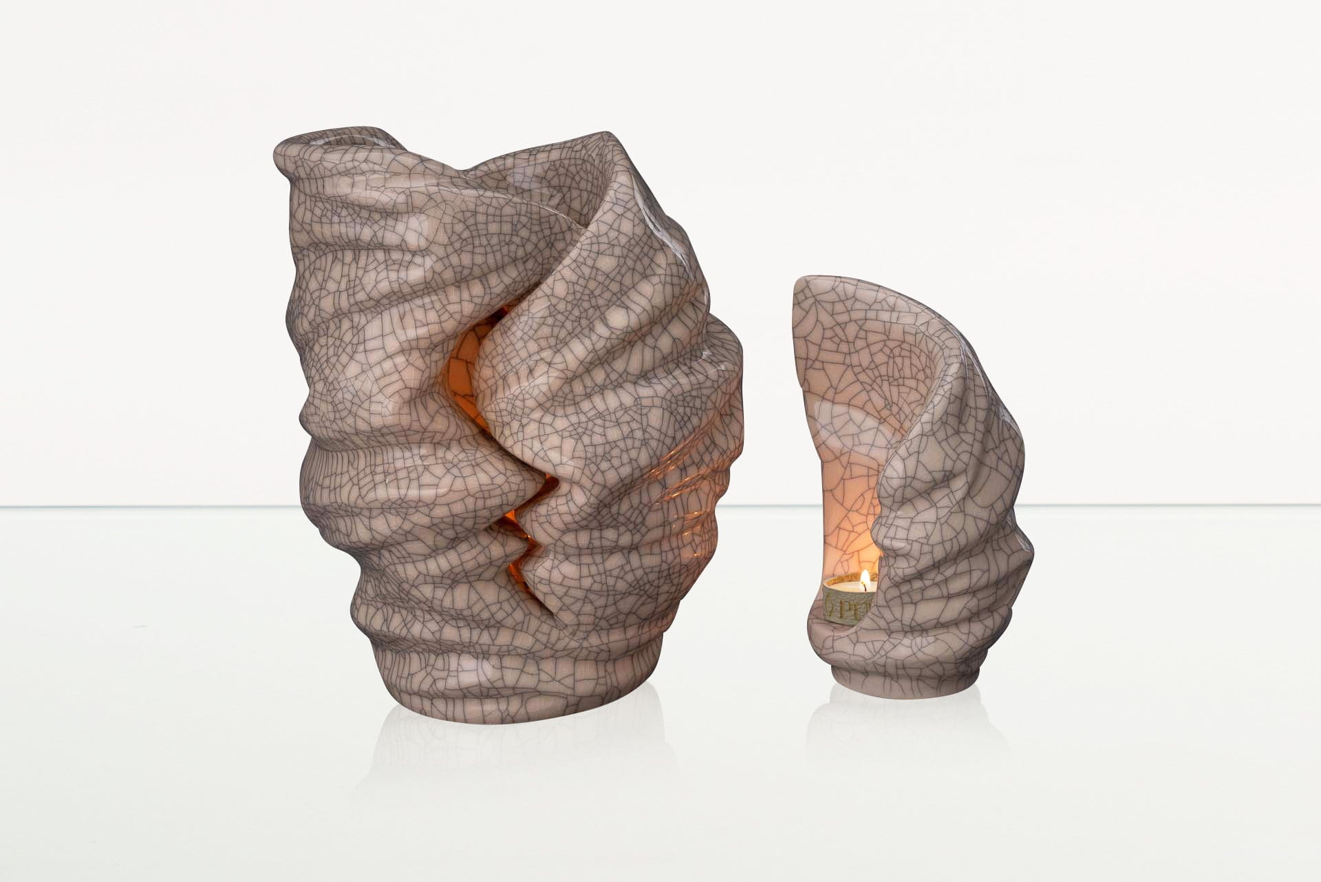 La luce della candela si riflette all’interno dell’urna, rivelando tutta la bellezza di questo memoriale artigianale.