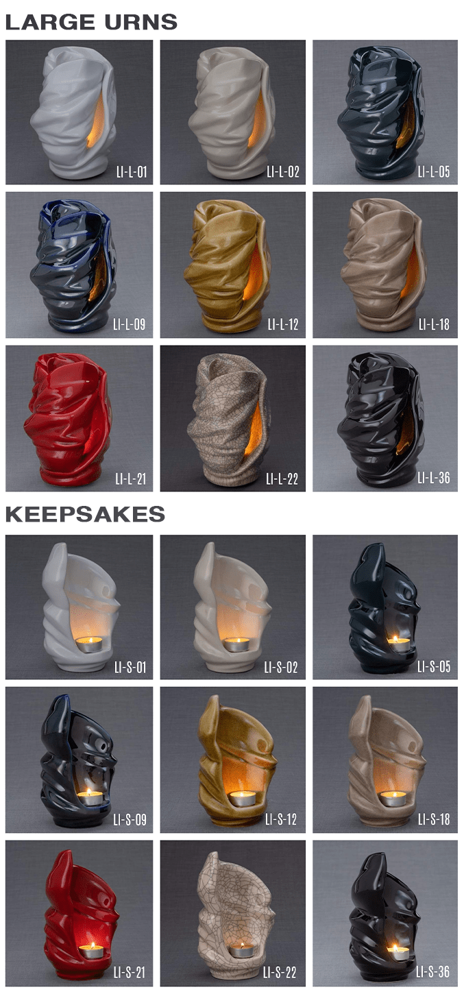 Si prega di notare che sono disponibili combinazioni di colori (l’urna grande e la mini-urna/keepsake possono essere di colori diversi).