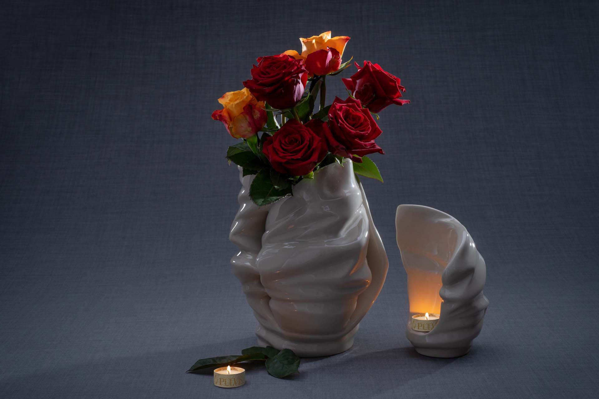 La luce soffusa della fiamma si riflette in modo quasi celestiale sulle linee armoniose di questa urna a grandezza naturale, esaltandone naturalmente la bellezza.