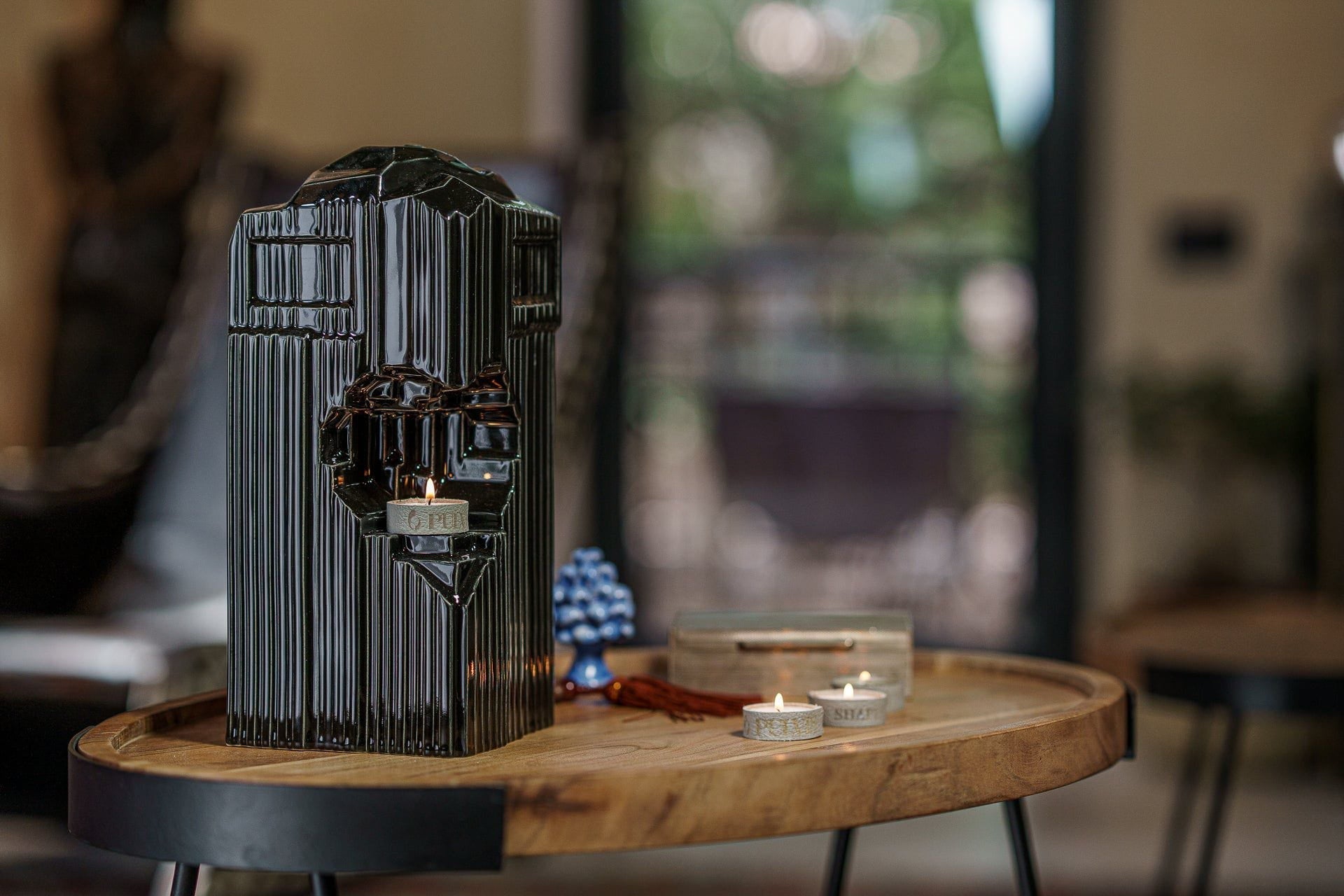 La profonda finitura nera lucida di questa urna in ceramica incornicia perfettamente la candela al suo interno, valorizzando al tempo stesso ambienti sia moderni sia tradizionali.