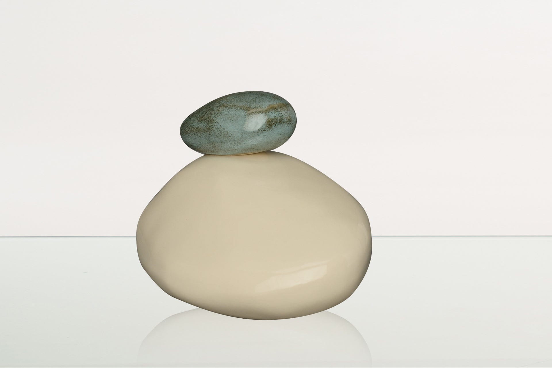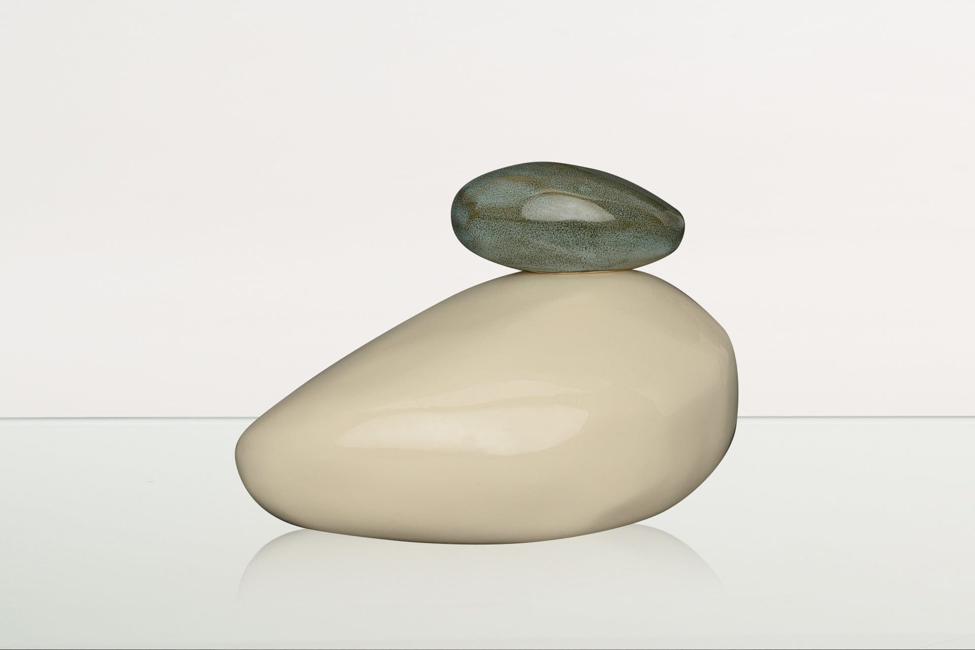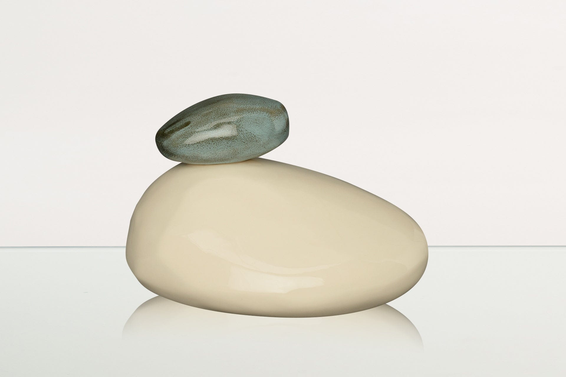 Le curve pulite e naturali delle pietre enfatizzano la tranquillità, mentre la ceramica bianca, che rappresenta compassione, purezza e pace, crea un memoriale elegante ma al tempo stesso discreto per la persona amata. La pietra più piccola, posta sopra, è disponibile in verde intenso o in un azzurro chiaro dalla texture particolare, entrambe splendide evocazioni del mondo naturale che ci circonda.