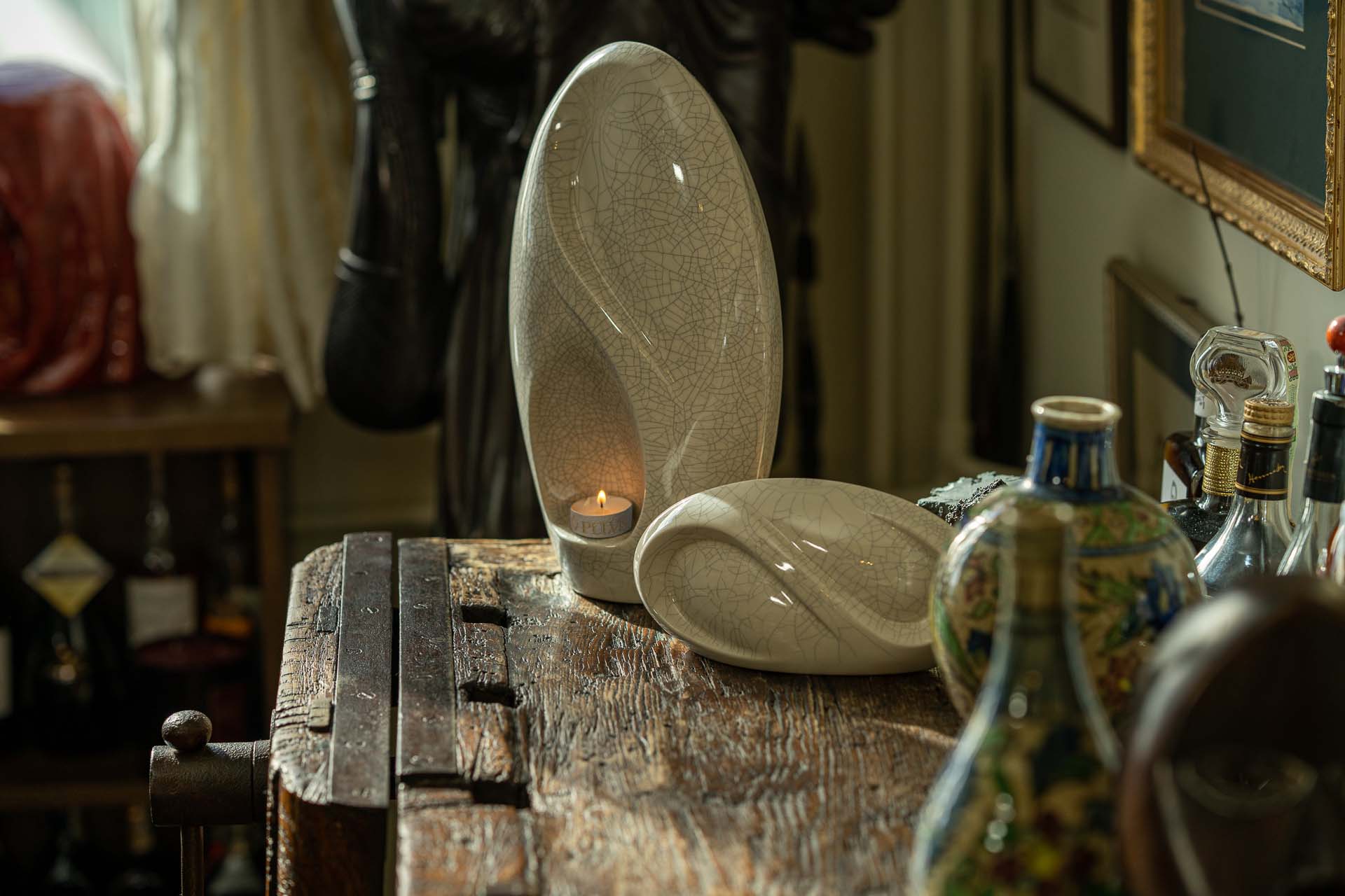 La collezione comprende urne per adulti, urne di grandi e medie dimensioni, urne ricordo e urne per animali, realizzate in ceramica, legno, bronzo, carbonio, pelle, vetro e acciaio. Ogni pezzo è lavorato a mano da artigiani esperti nell’Unione Europea, secondo i più alti standard qualitativi.