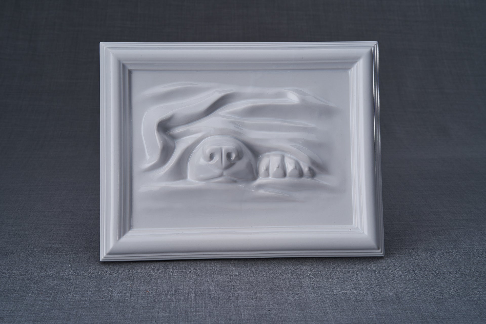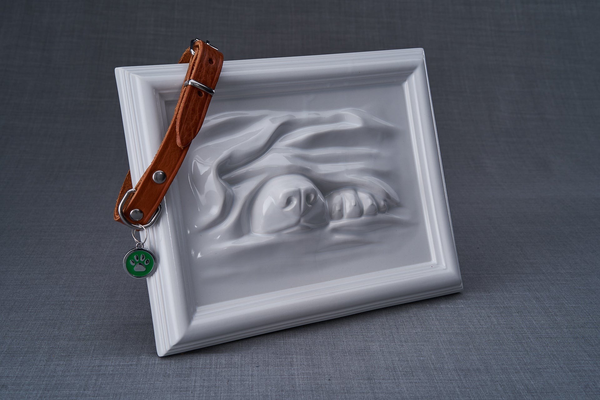 Bellissima urna crematoria in ceramica per cani. Abbiamo progettato questa urna commemorativa per animali domestici in modo da poterti aiutare a celebrare una vita piena di amore e ricordi felici.