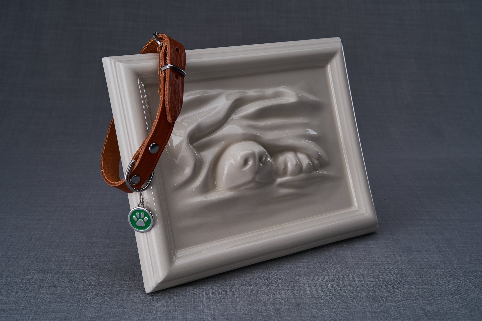 Bellissima urna crematoria in ceramica per cani. Abbiamo progettato questa urna commemorativa per animali domestici in modo da poterti aiutare a celebrare una vita piena di amore e ricordi felici.