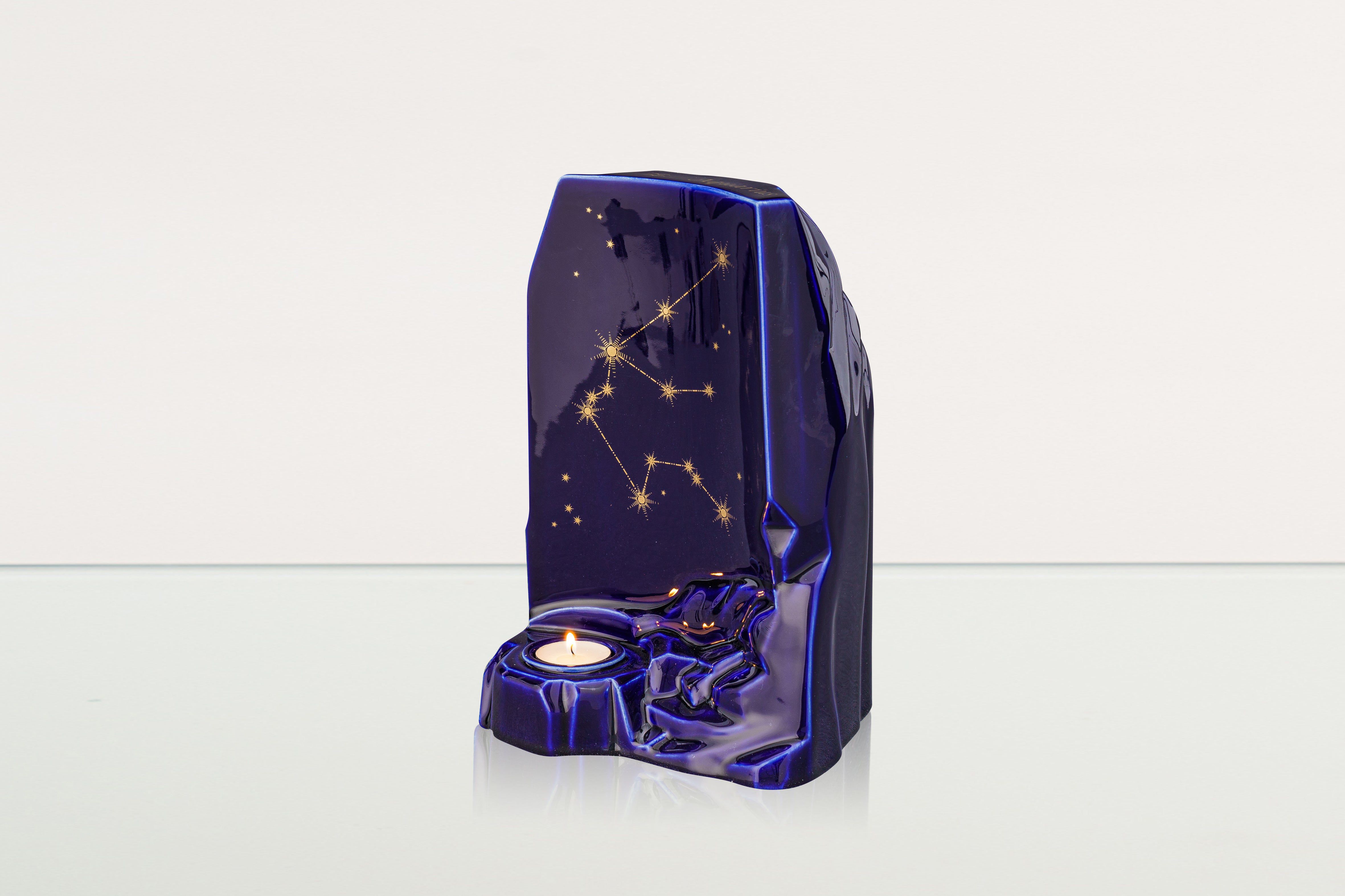 This gorgeous zodiac memorial, depicting the "Aquarius" constellation is crafted from premium quality ceramic. Representing a blue night sky, this premium handmade urn for ashes is the ideal memorial for a loved one. The Zodiac Urn collection is glazed in dark blue, having a place for a memorial candle.