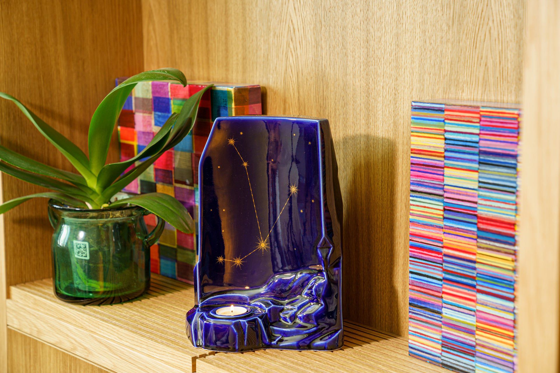 La collezione di Urne Zodiacali è smaltata in blu scuro e dispone di uno spazio per una candela commemorativa.