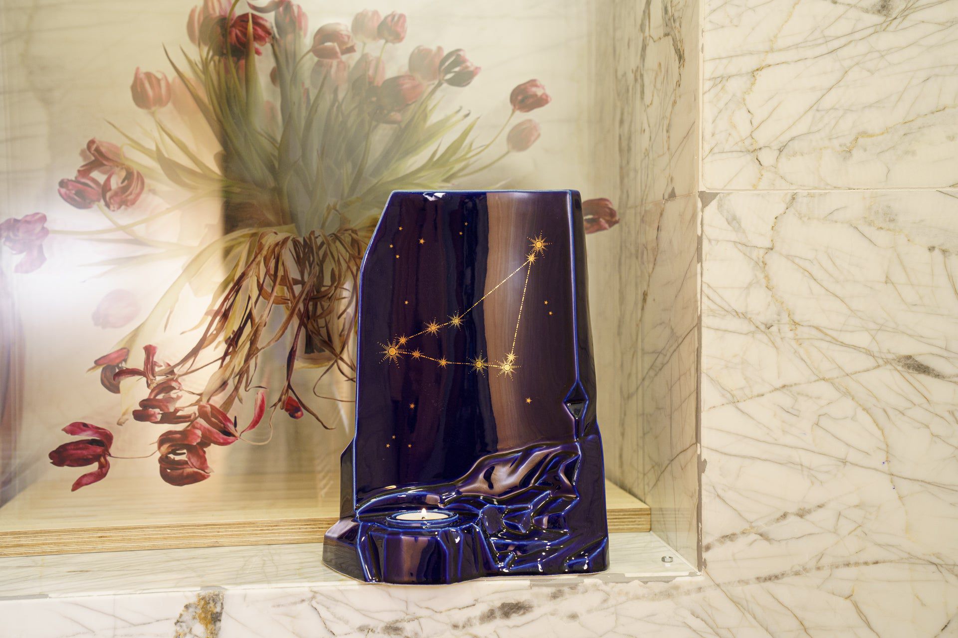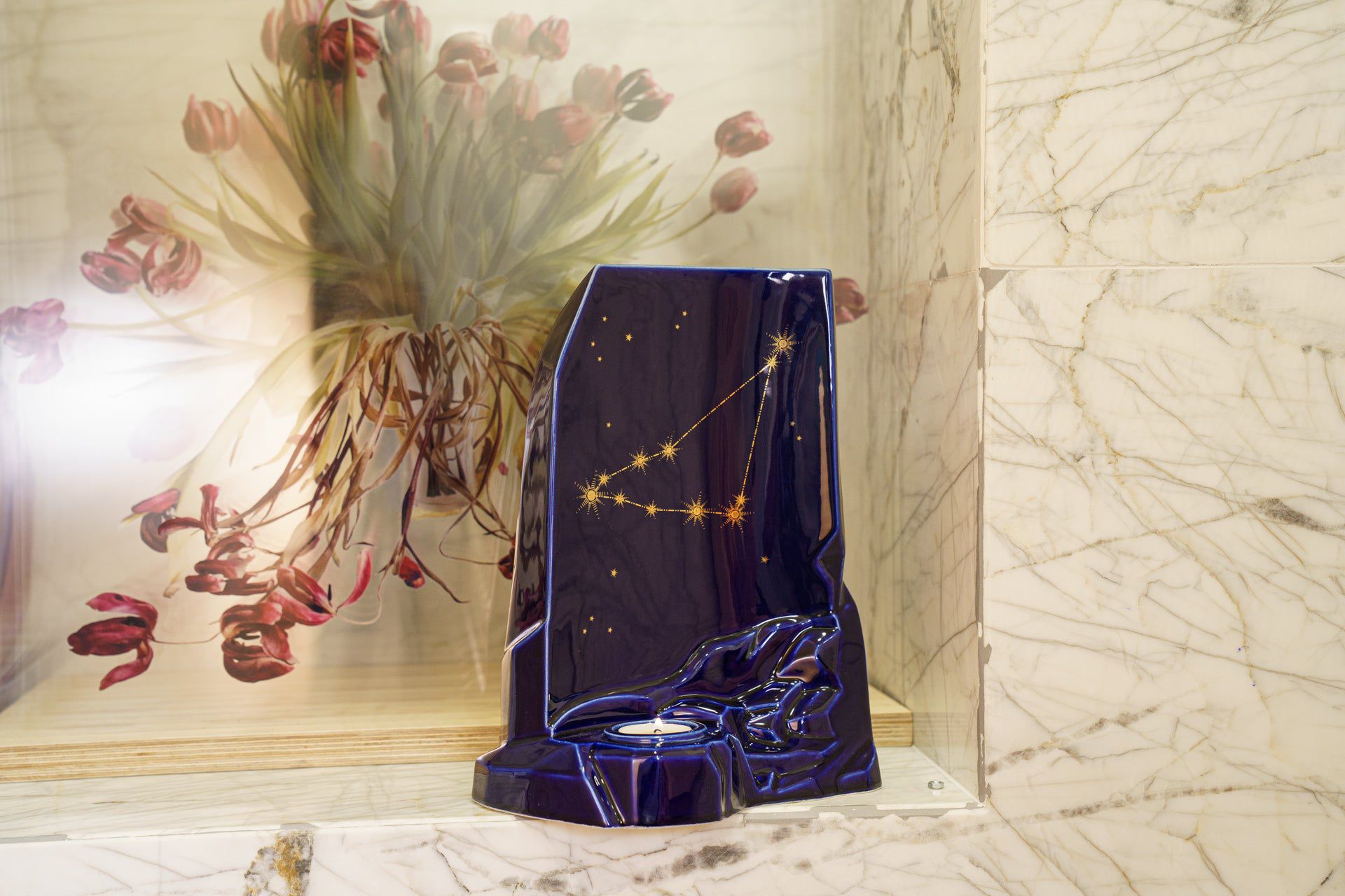 La collezione di Urne Zodiacali è smaltata in blu scuro e dispone di uno spazio per una candela commemorativa.