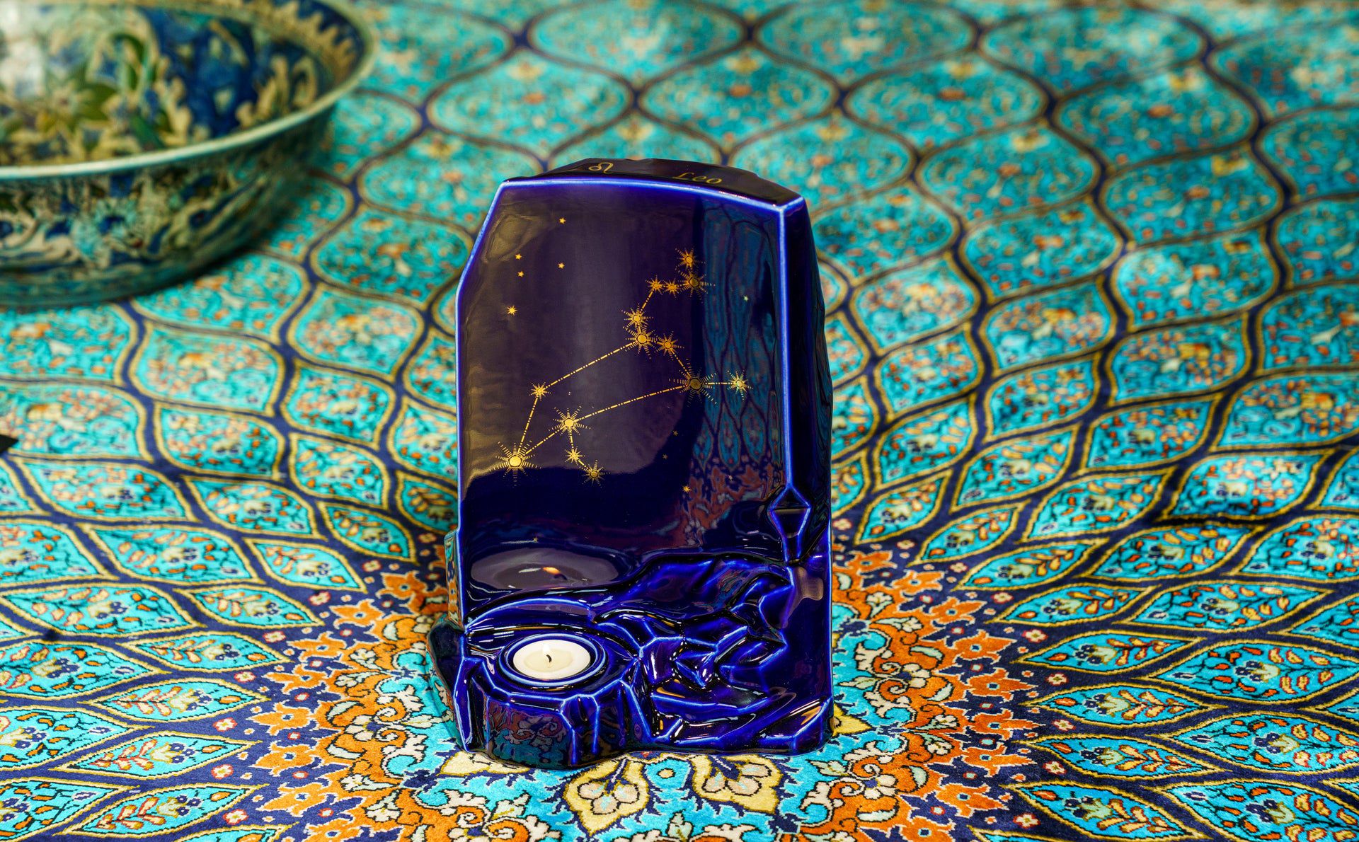 La collezione di Urne Zodiacali è smaltata in blu scuro e dispone di uno spazio per una candela commemorativa.