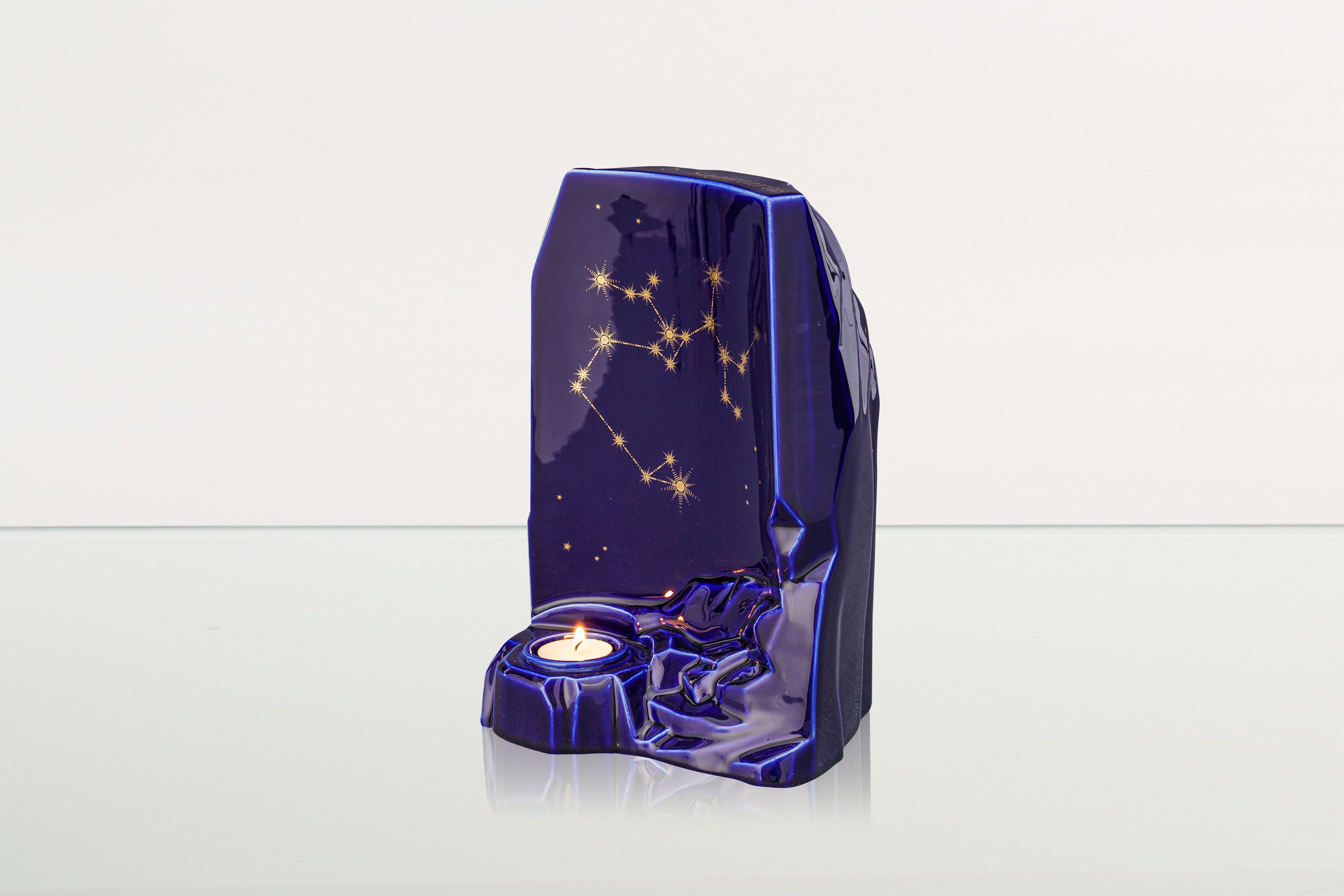 La collezione di Urne Zodiacali è smaltata in blu scuro e dispone di uno spazio per una candela commemorativa.