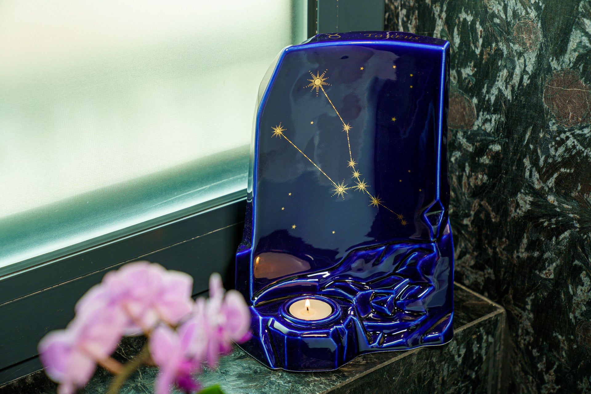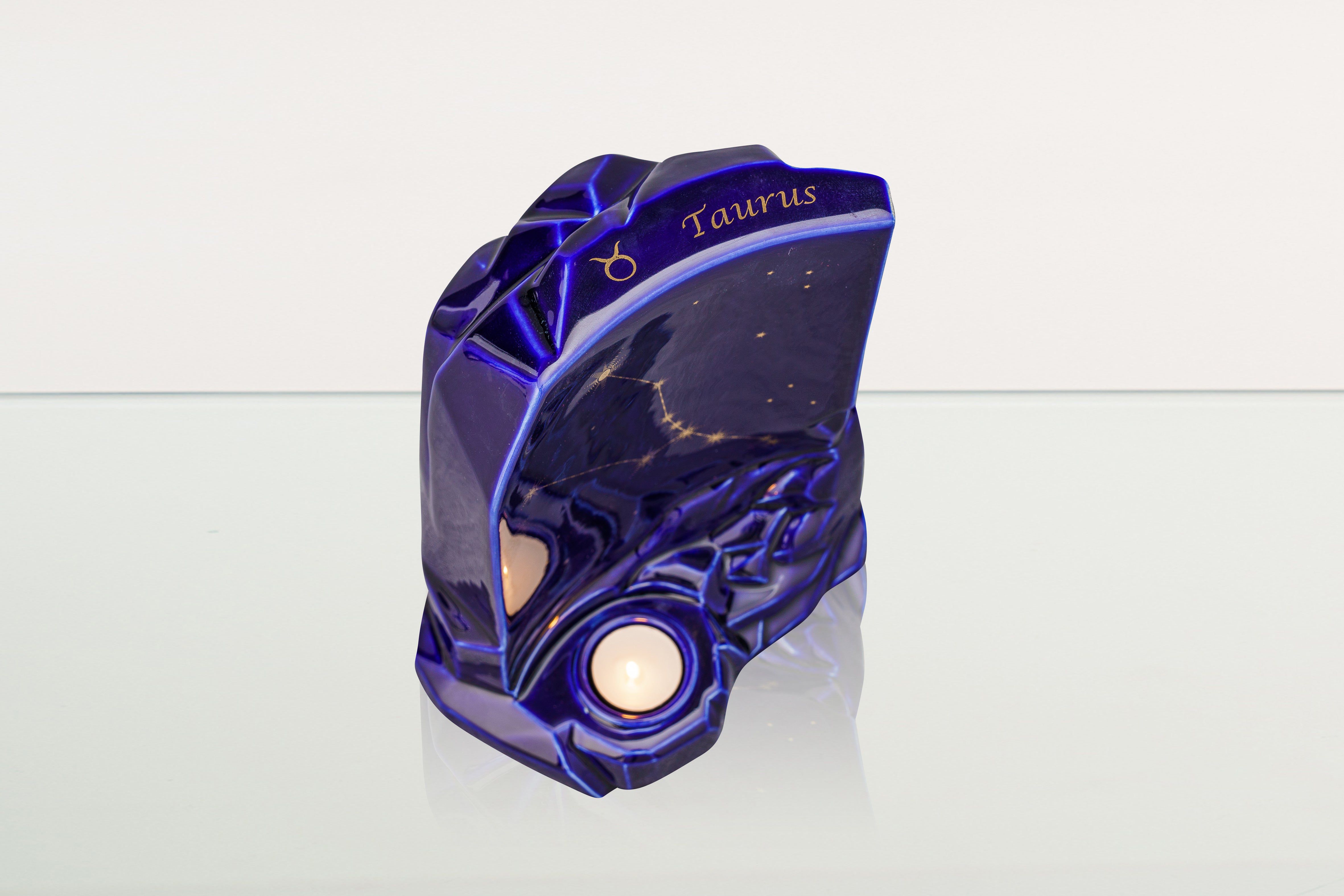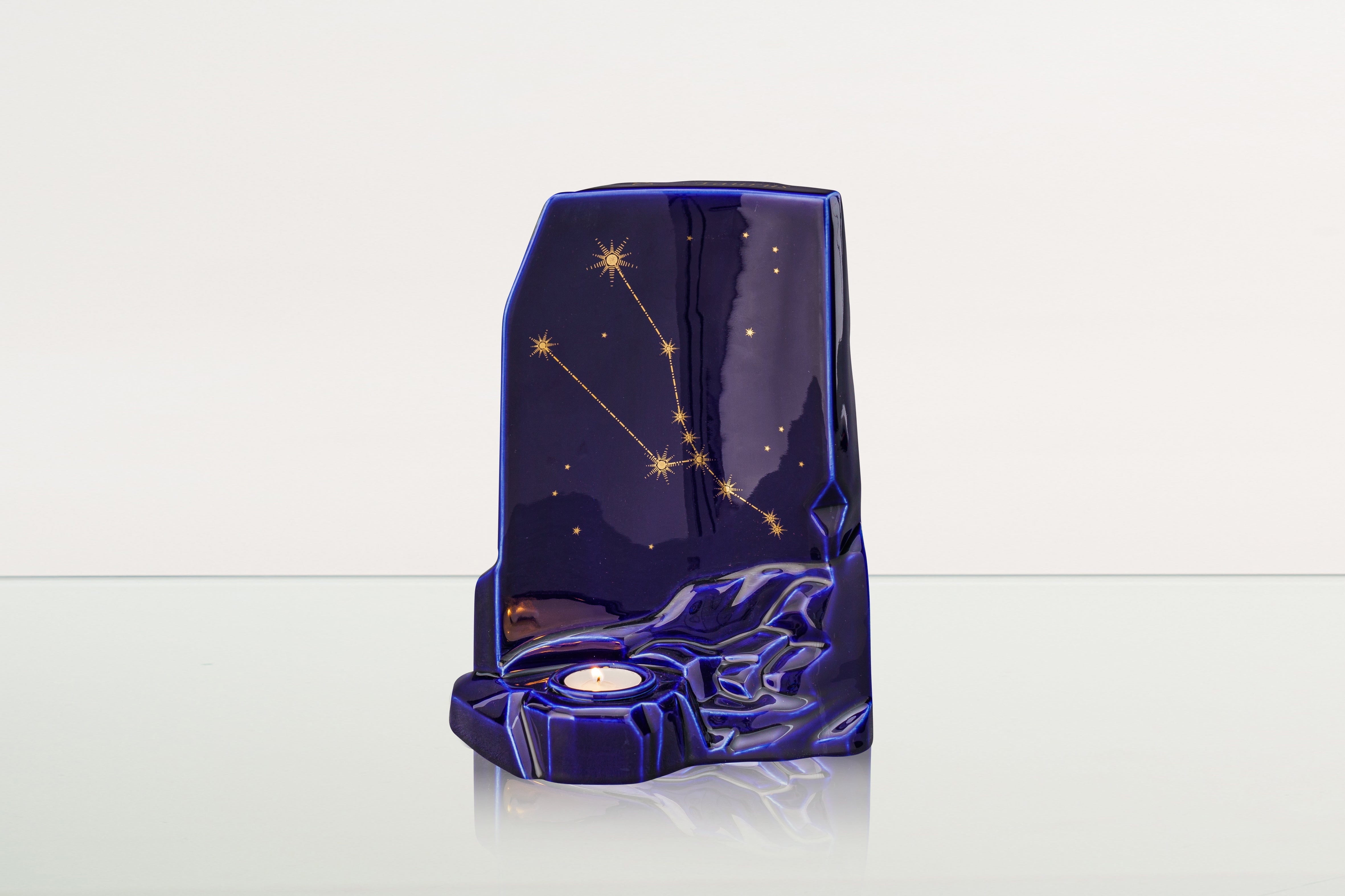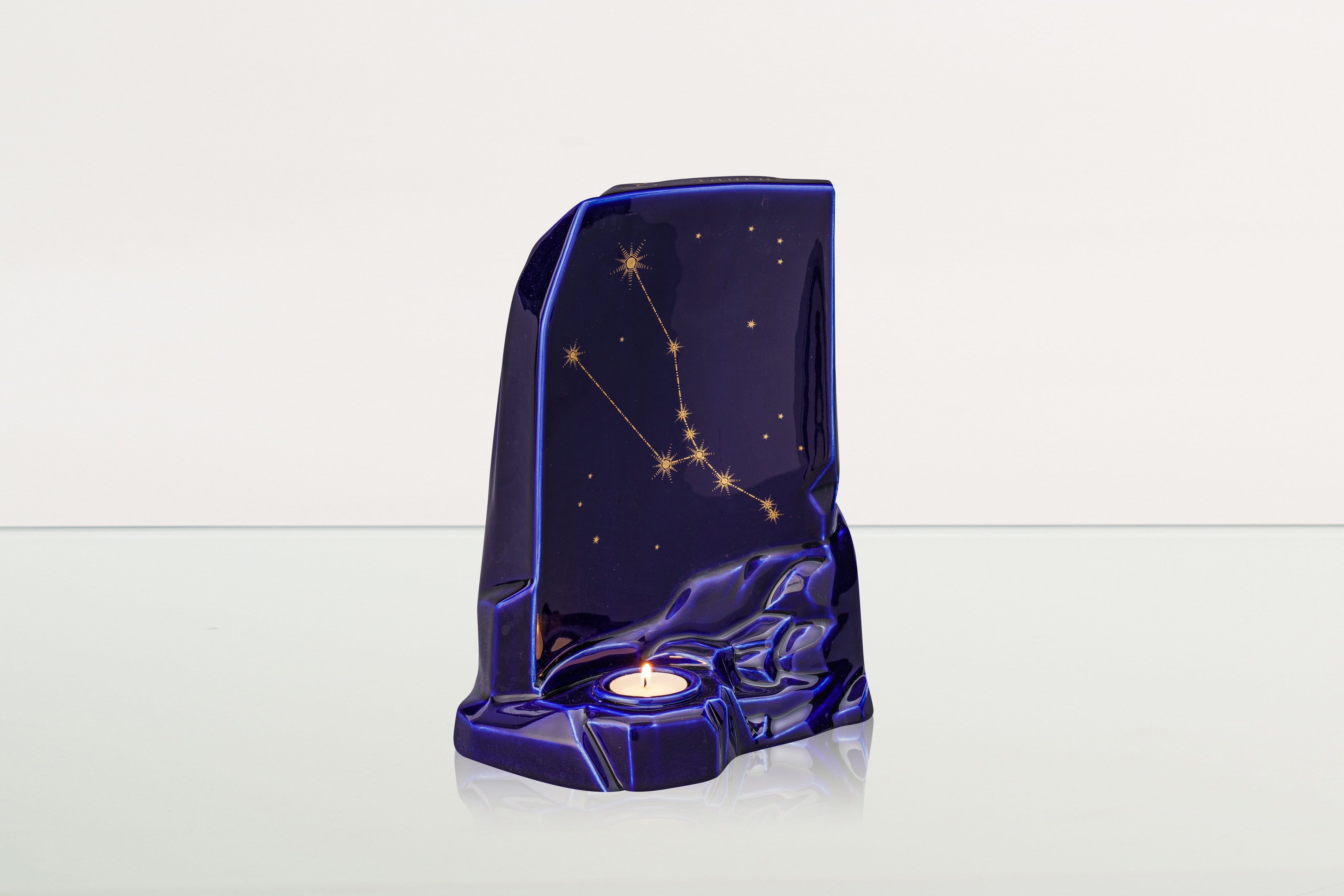 La collezione di Urne Zodiacali è smaltata in blu scuro e dispone di uno spazio per una candela commemorativa.